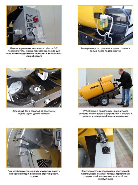 Отличительная особенность «Master BV500» заключается в наличии мощного осевого вентилятора высокого давления (до 440-ка Па) и двигателя, работающего на дизеле и способного обеспечивать его бесперебойную работу. Последний располагает степенью защиты IP 43, существенно продлевающей период его эксплуатации.