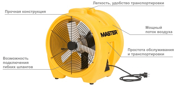 За счет высокой производительности, модель вентилятора Master BL 8800 способна эффективно продувать множество различных помещений. Это особенно актуально на производственных площадках, в промышленности и на строительных объектах. Мощный электродвигатель создает нагнетательное давление в 500ПА, что в свою очередь способствует быстрой и эффективной циркуляции воздушного потока. Оборудование можно оснастить шлангами, таким образом, настроив Master BL 8800 на сторонний отвод или приток.
